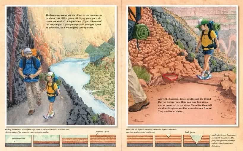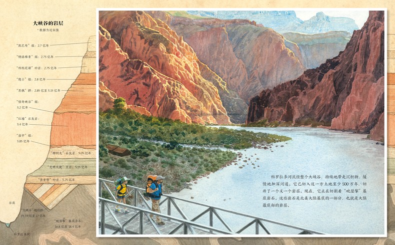 陈振盼用水彩、水粉和墨水再现了鬼斧神工的景观,用震撼人心的拉页展示了大峡谷史诗般的壮丽全景,用图解、剖面和依据实地考察绘制的动物、植物和化石插画表现了多重地层数亿年的演化形成。