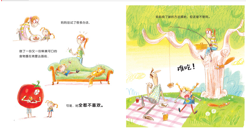 叫弗雷达的小女孩儿太爱挑食了,无论爸爸妈妈做什么菜肴,她总是摆出一副嫌弃的表情,说:“难吃!”无论是妈妈做的可口蔬菜,爸爸做的大鱼大肉,奶奶做的海鲜大餐,还是叔叔带来的异国菜肴,她都不爱吃。她因为营养不良而越变越小,小猫“啊呜”一口把她吃了下去……